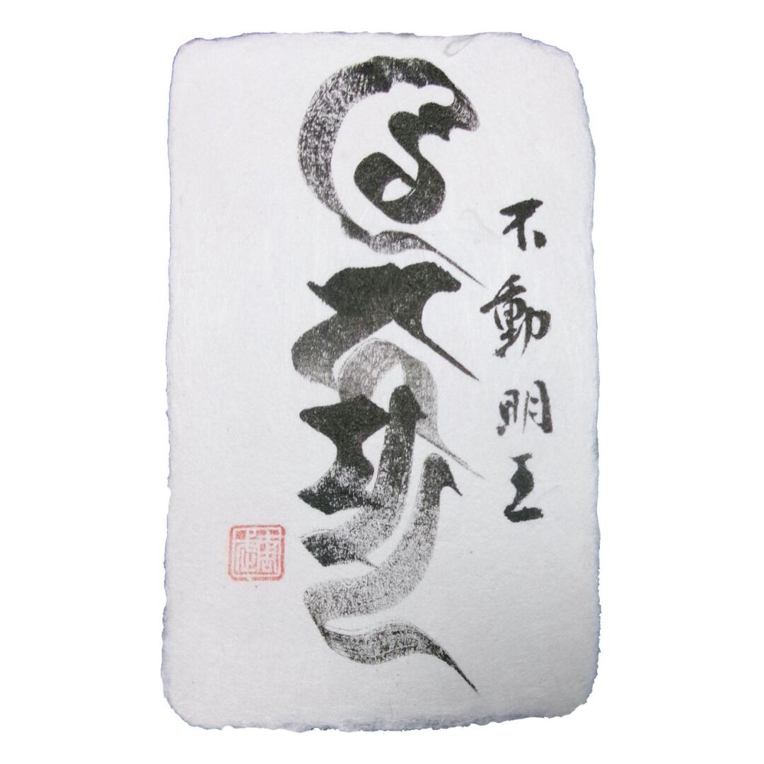 ネパール巡礼の旅から帰還された田邊師が、梵字の神秘性をもって、不動明王の力強さと温かみを、龍のイメージとともに表したもので、直筆ならではの力強さと筆致の美しさが魅力となっています。